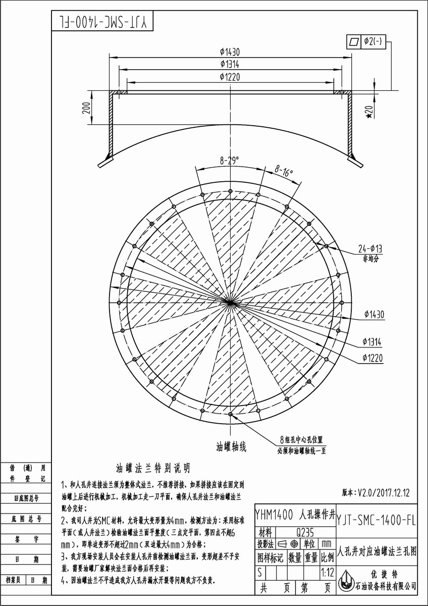 2, to prevent the installation Angle deviation, adopt non-uniform structure, wrong one hole Angle, manhole Wells can not be installed, only the manhole well installation pipeline face toward the axis of the oil tank can be installed and aligned with the installation hole, can bolt tight;
